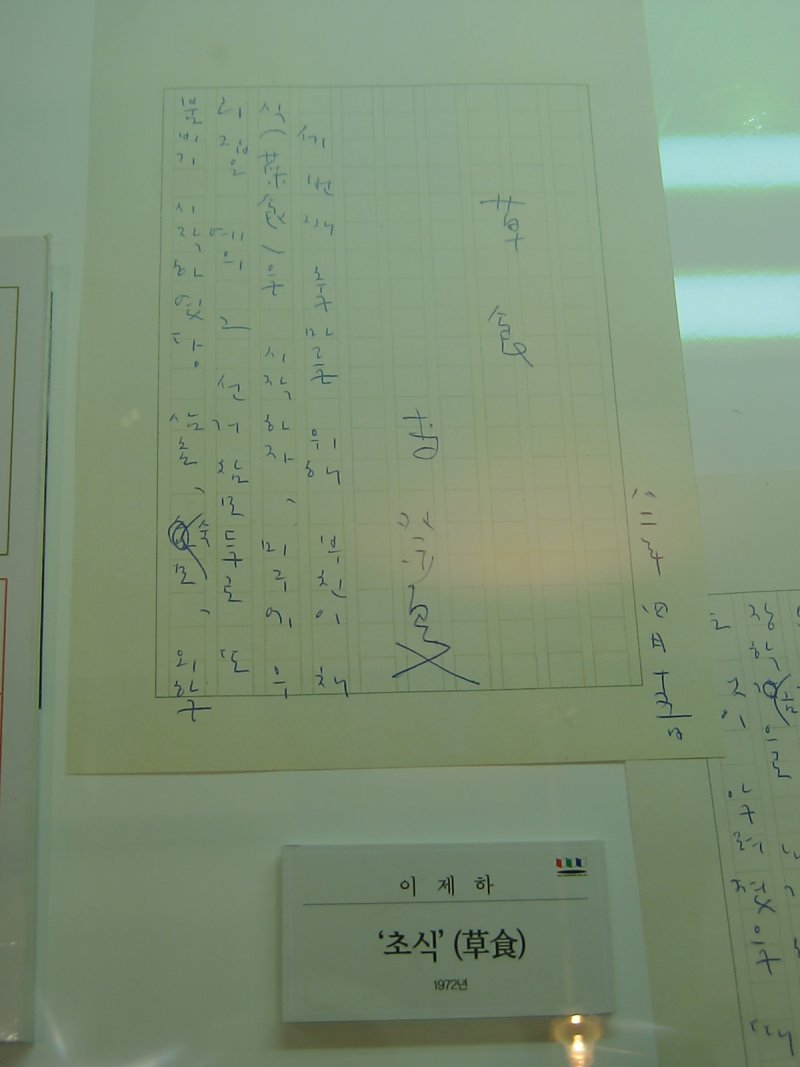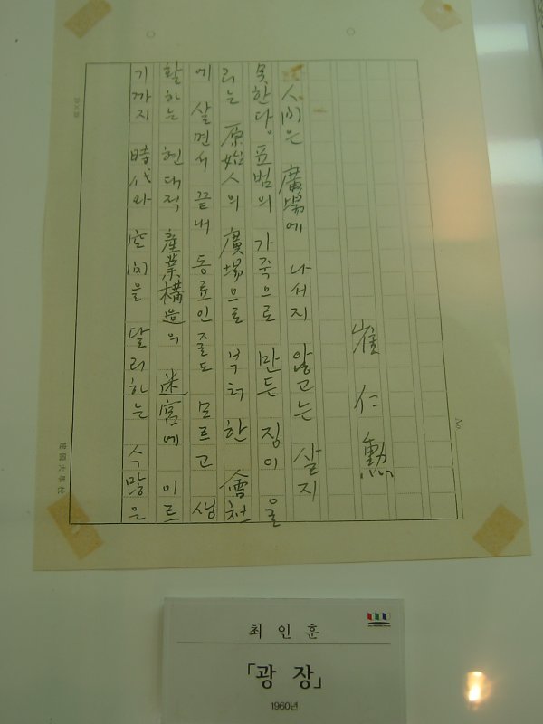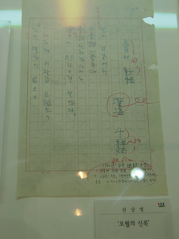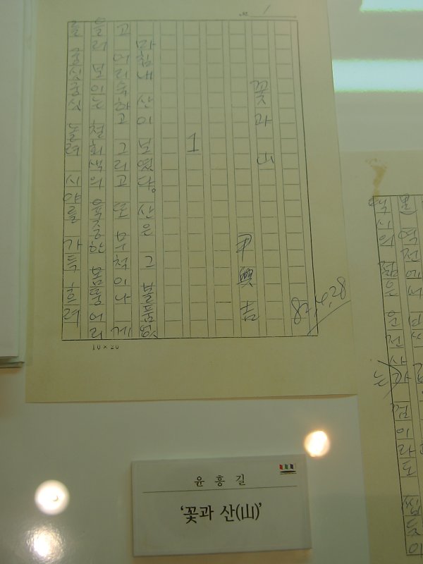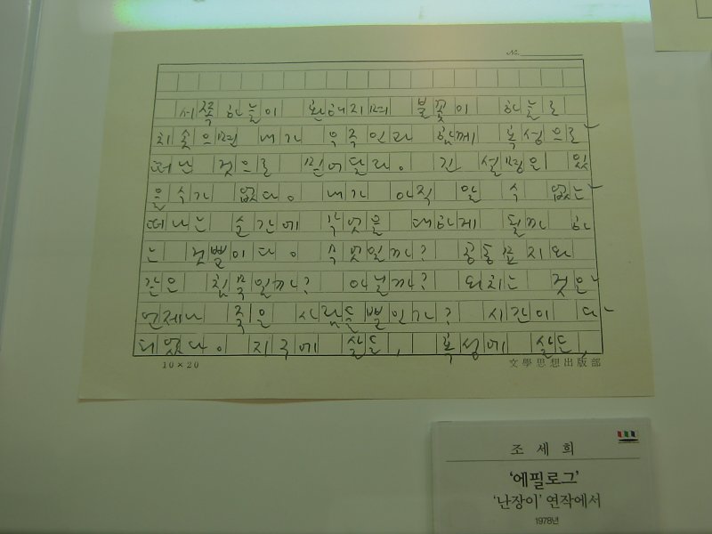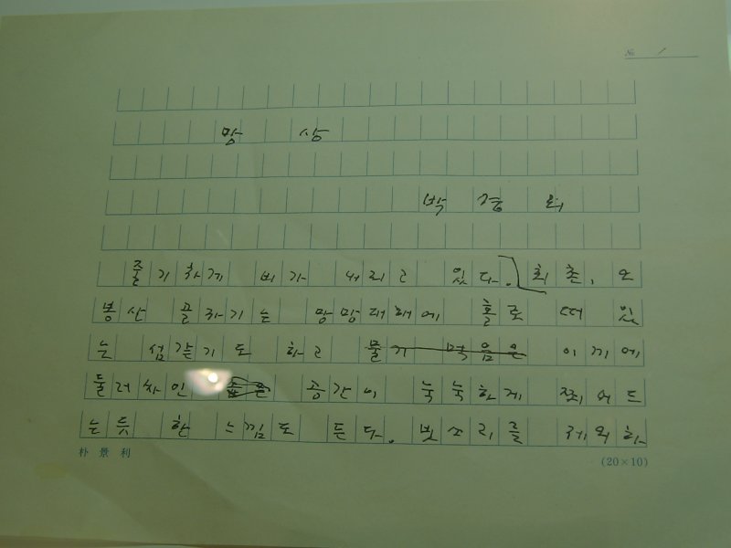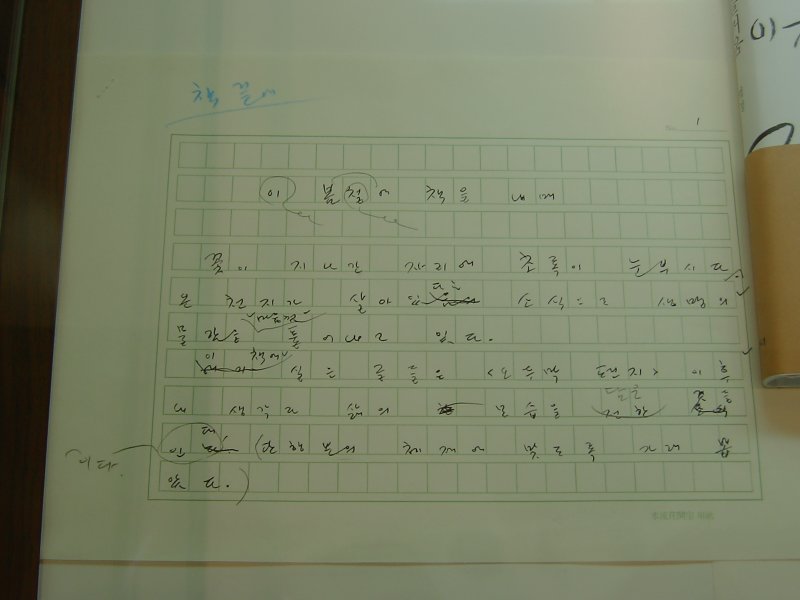 서울도서전에서 찍은 육필원고 사진입니다. 요즘 분들이야 다 컴퓨터를 이용하시겠지만 이렇게 손으로 쓴 원고를 보고 있으니 묘한 기분이 들더군요. 지금 올린 것 보다 더 많은 분들의 글이 있었는데 사진은 다 찍었지만 상태가 좋지 않아서 일부만 올립니다. 올린 것도 사진 상태는 않좋습니다. ㅠ.ㅠ