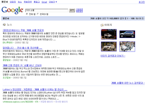 상위 뉴스 3건을 상위에 웹문서 처럼 보여주는 경우 (키워드 : 기아 소울 / 이 외에 "구글", "스팸" 등이 있네요)