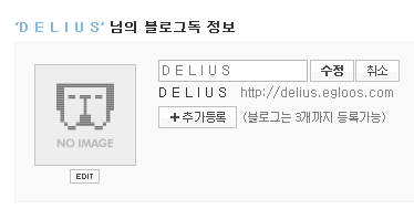 이름이 공개된다고 뜨끔할 만큼 악하게 살지는 않았지만 ^.^; 그래도 원했던 상황은 아니어서 잠깐 당황하면서 원래 닉네임인 D E L I U S로 수정했습니다. 이글루스에서 사전 등록을 했을 때 노출 될 이름을 실명으로 하겠냐는 물음이 있었던 것 같지 않은데, 기본 노출값을 ID로 해주었으면 하는 아쉬움이 있네요.