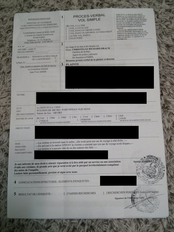 순식간에 일어난 일이라 헉 하면서 바로 뒤를 쫓아 따라 내렸지만 이미 어디로 달아났는지도 알 수 없었습니다. 정말 빠르더군요.... 그 정도 달리기 실력이면 육상을 하지 ㅠㅠ 하면서 허탈해 하고 있었는데 한 분이 다가오셔서 어찌된 일인지를 영어로 물어오셨습니다. 제가 있었던 일을 설명하자 종종 이런 일이 있어서 다들 열차 안에서는 조심한다는 말씀 + CCTV를 확인해보겠냐고 물어보시더군요. 물건은 이미 포기한 상태였지만 혹시나 하는 마음에 그게 가능한지 물어봤더니 그 분이 역무원에게 가서 몇 마디 하시더니 경찰서의 확인(제가 신고를 하면)이 있으면 가능하다고 하시더군요. CCTV를 볼 생각은 없었지만 여행자 보험에서 일부 보상이라도 받기 위해서는 경찰서에 신고는 해야한다는 것을 어렴풋이 알고 있던 터라 경찰서가 어디 있는지와 프랑스어로 제가 겪은 일을 써주십사 부탁드렸습니다.(지금 생각하니 너무 황당한 일을 겪어서 그런지 영어가 술술... 예전에 심슨에서 바트가 프랑스에서 노예처럼 일하다가 탈출해서 프랑스어를 술술하던 편이 떠오르네요 ^^) 그 분은 흔쾌히 근처의 경찰서 위치를 약도를 그려서 알려주시고 거기에 제가 기차에서 소매치기로 물건을 잃어버려서 신고를 하고 싶다는 내용을 프랑스어로 적어주셨습니다. 거기에 혹시라도 경찰이 잘 모르겠다고 하면 자신이 프랑스어로 설명을 해줄테니 이 전화번호를 경찰에게 말하라며 전화번호를 적어주시는 친절까지! 감격 ㅠㅠ