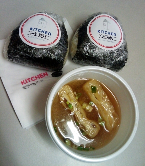 지난번에는 도시락을 먹었고, 오늘은 오니기리 2개, 된장국을 주문해서 가지고 왔어요. 이쁜 포장지에 담긴 참치간장 오니기리(1,500원), 매콤멸치 오니기리(1,800원), 된장국(500원) = 3,800원. 오니기리는 즉석에서 만들어 주고 된장국은 따로 준비. 참치간장은 만족스러웠는데 매콤멸치는 밥이 좀 모자란 느낌이었습니다. 다음에는 다른 오니기리를 주문해볼 예정입니다. ^^