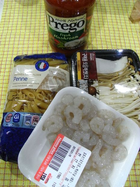 어제 저녁에 장본 재료로 토요일 점심 파스타를 만들어 먹었습니다.(사실 조립해 먹었다는 것이 맞겠군요 ^^). 원래는 드라마 [파스타]에 나온 알리오 올리오나 마늘 스파게티를 해먹고 싶었지만 생각해 보니 집에 올리브 기름도 없고, 깐 마늘도 없다는 것을 장보면서 깨닫고 그냥 파스타로 전환했어요. 흑흑