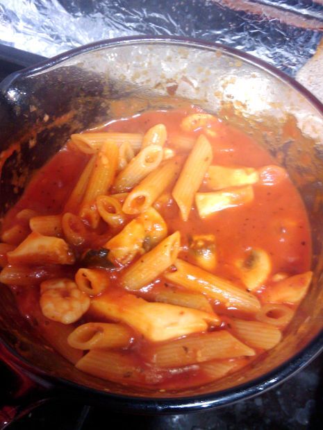 2. 펜네 삶고(한 7분?) 버섯, 새우 볶은 것에 소스넣고 끓이기