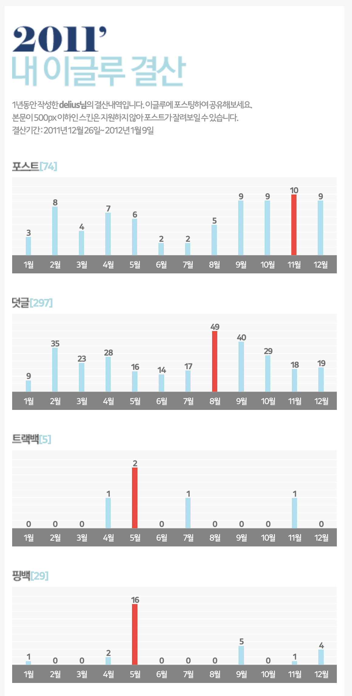 1년 동안의 글을 문고판 시리즈로 낸다면 7권까지 낼 수 있겠네요. delius님은 올 한해 이글루스에서 8,603번째로 게시물을 가장 많이 작성하셨네요.