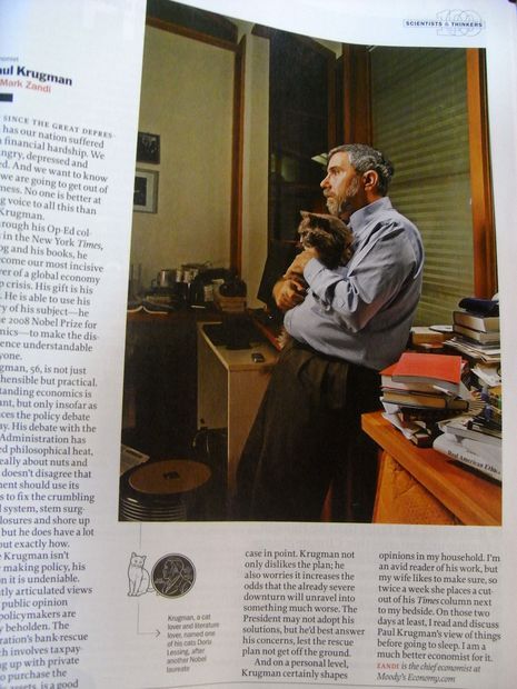 2010/09/05 23:36 헌책방에서 산 2009년판 [타임 Time] 선정 '가장 영향력 있는 100인'을 보다 보니(읽다 보니가 아니라) 폴 크루그먼이 고양이를 안고 있는 사진이 눈에 띄더군요.(온라인판에는 안 올라온 사진이네요.) 고양이 이름은 도리스 레싱~ one of his cats라고 하는 것을 보니 고양이를 많이 기르나봐요. :-) [The World's Most Influential Person], TIME, 2009 p.s. 혹시 같은해에? 해서 찾아봤는데 도리스 레싱은 2007년, 폴 크루그먼은 2008년 수상자군요.