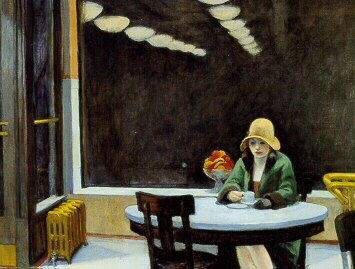 2007. 7. 1. 22:41 에드워드 호퍼, , 1927 ... (1927)에서는 여자가 혼자 커피를 마시며 앉아 있다. 늦은 시간이다. 여자의 모자와 외투로 보건대 밖은 춥다. 여자가 있는 실내 공간은 크고, 불은 환하고, 텅 비어 있는 것 같다. 장식은 기능적이다. 돌을 덮은 탁자, 튼튼하게 만든 검은 나무 의자, 하얀 벽. 여자는 사람을 꺼리는 듯하고 약간 겁을 내는 것 같다. 공공장소에 혼자 앉아 있는 것에 익숙하지 않은 사람이 분명하다. 무슨 일인가 잘못된 모양이다. 그녀를 보다 보면 어느새 그녀와 관련된 이야기, 배신이나 상실의 이야기를 상상하게 된다. 그녀는 커피를 입으로 가져가면서 손을 떨지 않으려고 애를 쓴다. 북미의 어떤 큰 도시, 2월의 밤 열한 시쯤일 것 같다. 은 슬픔을 그린 ..
